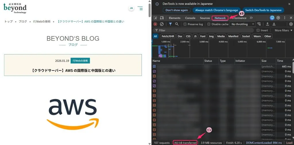 その後、ブラウザの右上画面にある「Network」の箇所を開きます。「Network」の箇所を参照すると、1ページあたりのデータ量が算出されます。