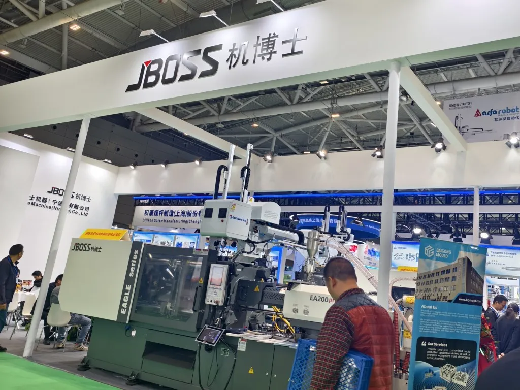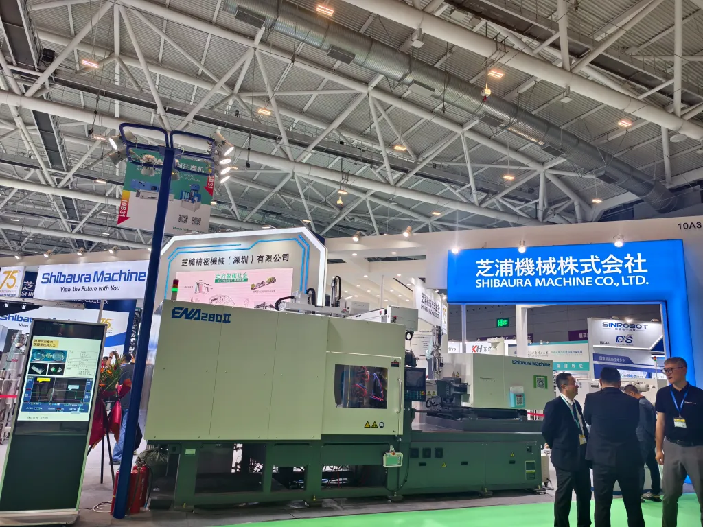 The booth sign reads “Shibaura Machinery Co., Ltd.”—it seems that Japanese companies are exhibiting here as well.