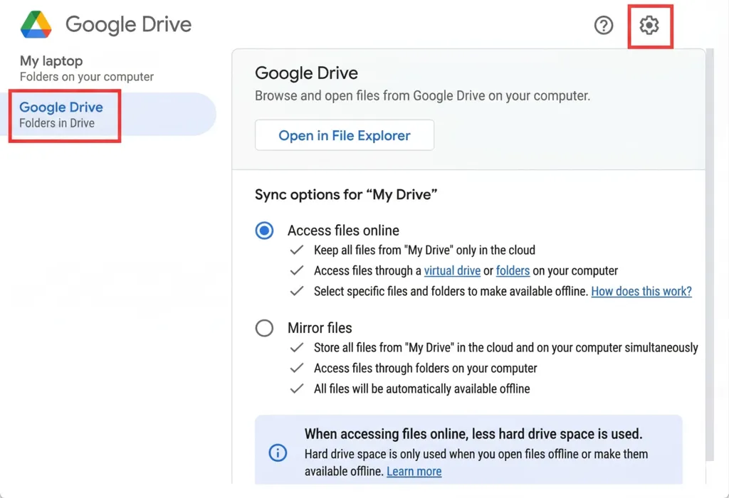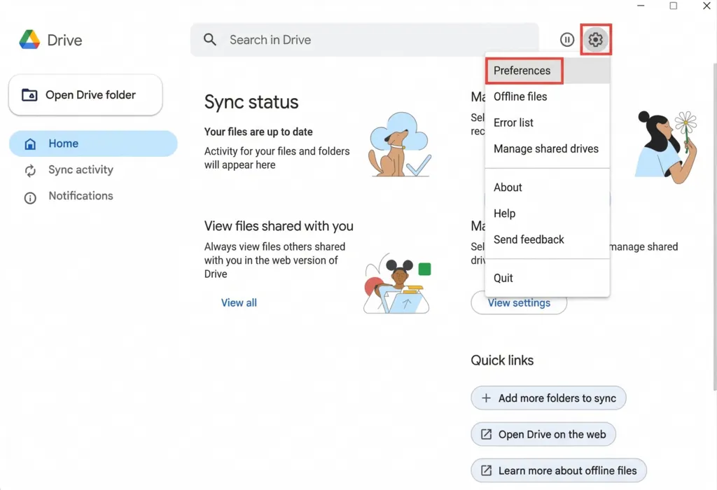 If you need to change the drive location, you can open Google Drive, click the gear icon in the upper-right corner to enter “Preferences”.