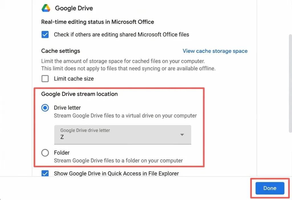 From there, select “Google Drive” on the left, then click the gear icon in the upper-right corner again, scroll down to find the “Drive letter” option, and change it to your desired location.