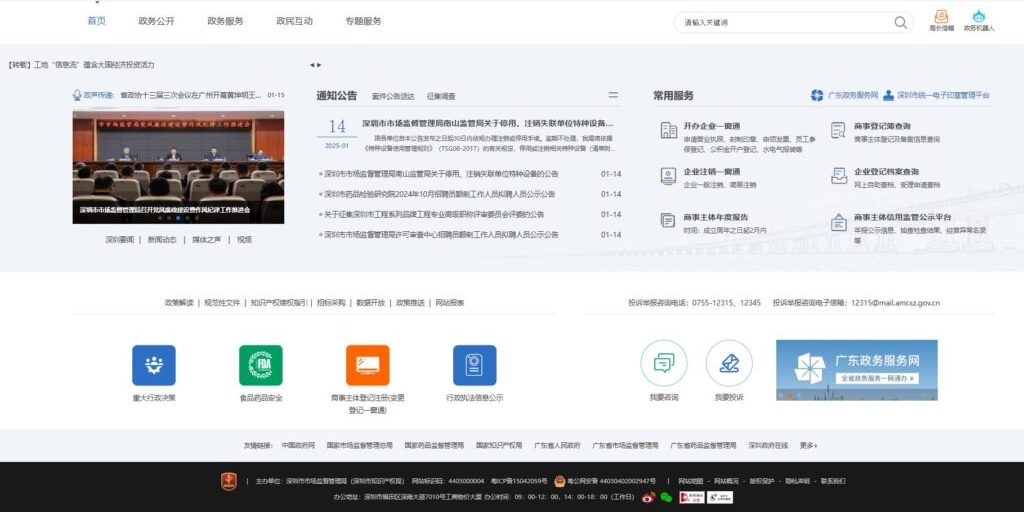 ① 在「深圳市市场监督管理局」官网完成申请和预约。