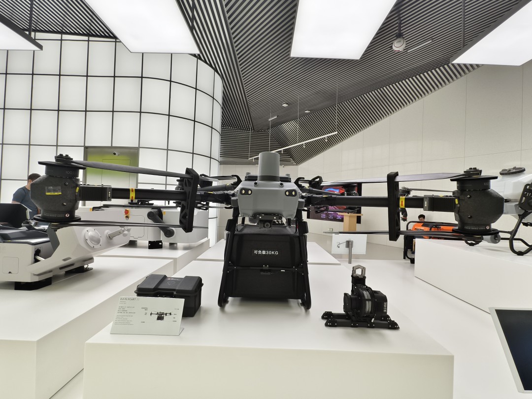店内还展示了最新款无人机,例如最大载重 30 公斤的 FlyCart30 等较大型无人机。因为是第一次亲眼看到实物,所以它的气势让我感到非常震撼。