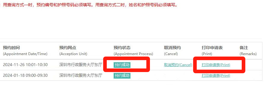 确认预约状态显示为「预约成功」后,点击「打印申请表」,下载带有预约编号的最新版「外国人签证证件申请表」。