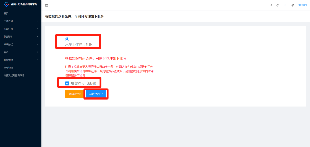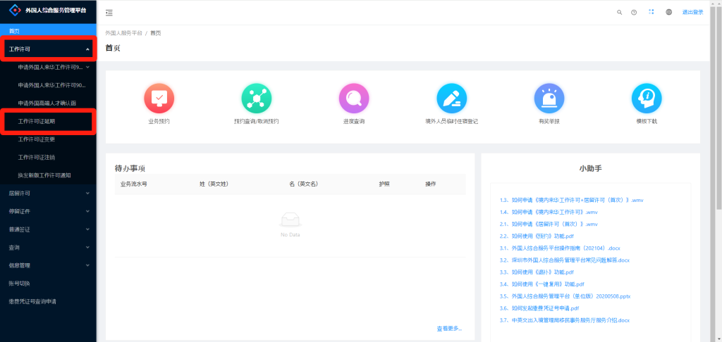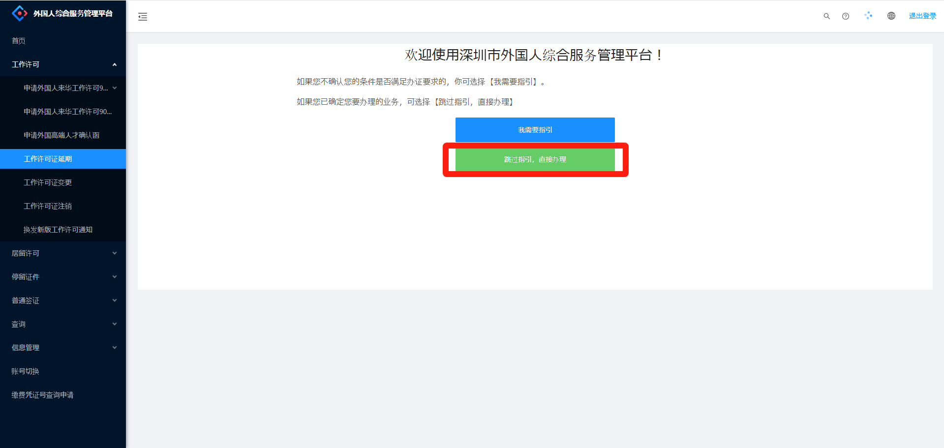 登录后,点击页面左侧菜单栏中的「工作许可」,再选择 「工作许可延期」即可进入申请环节。