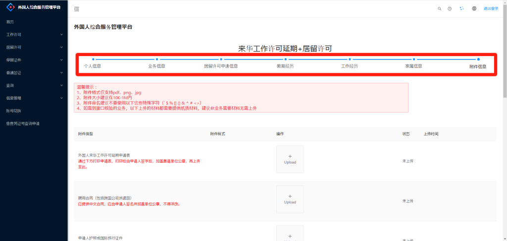 | 外国人来华工作许可延期申请表 | 中国への外国人工作許可証延期申請表 | 在「外国人服务平台」上传资料页可下载模版 |