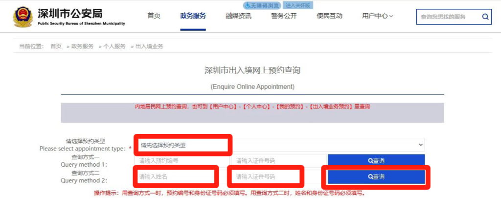 在接下来的页面中,需先将预约种类选择为「在深外籍人员预约」。然后在「查询方式二」中输入申请人的姓名及护照号码,点击「查询」,即可确认预约状态。